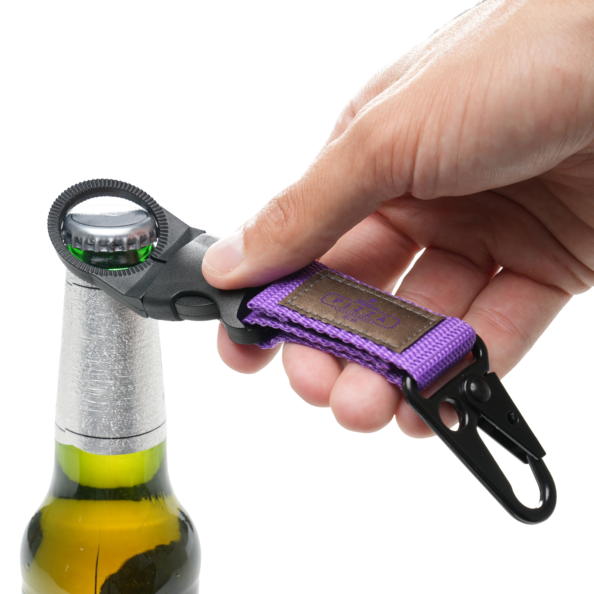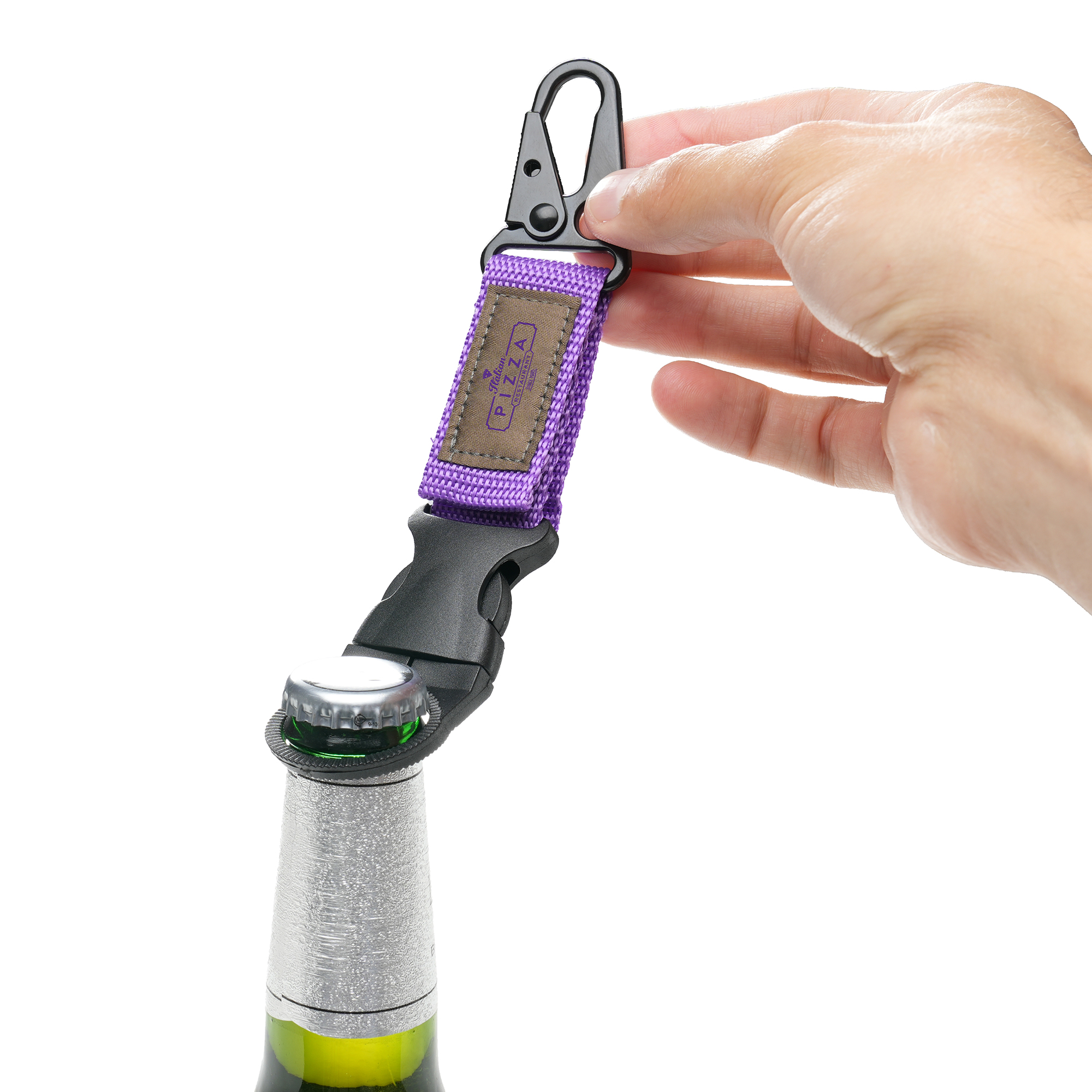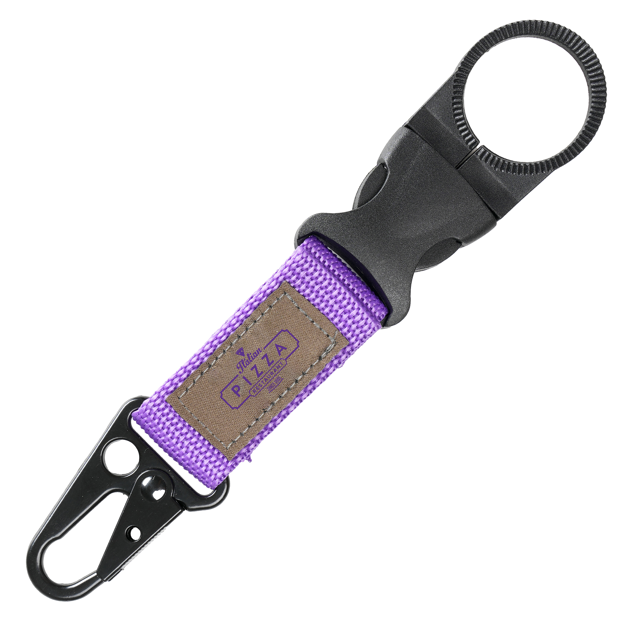 Heavy-duty metal carabiner with a durable polyester strap and bottle holder clip. Perfect for attaching to trousers, bags and more. 1-colour embroidered logo on patch.