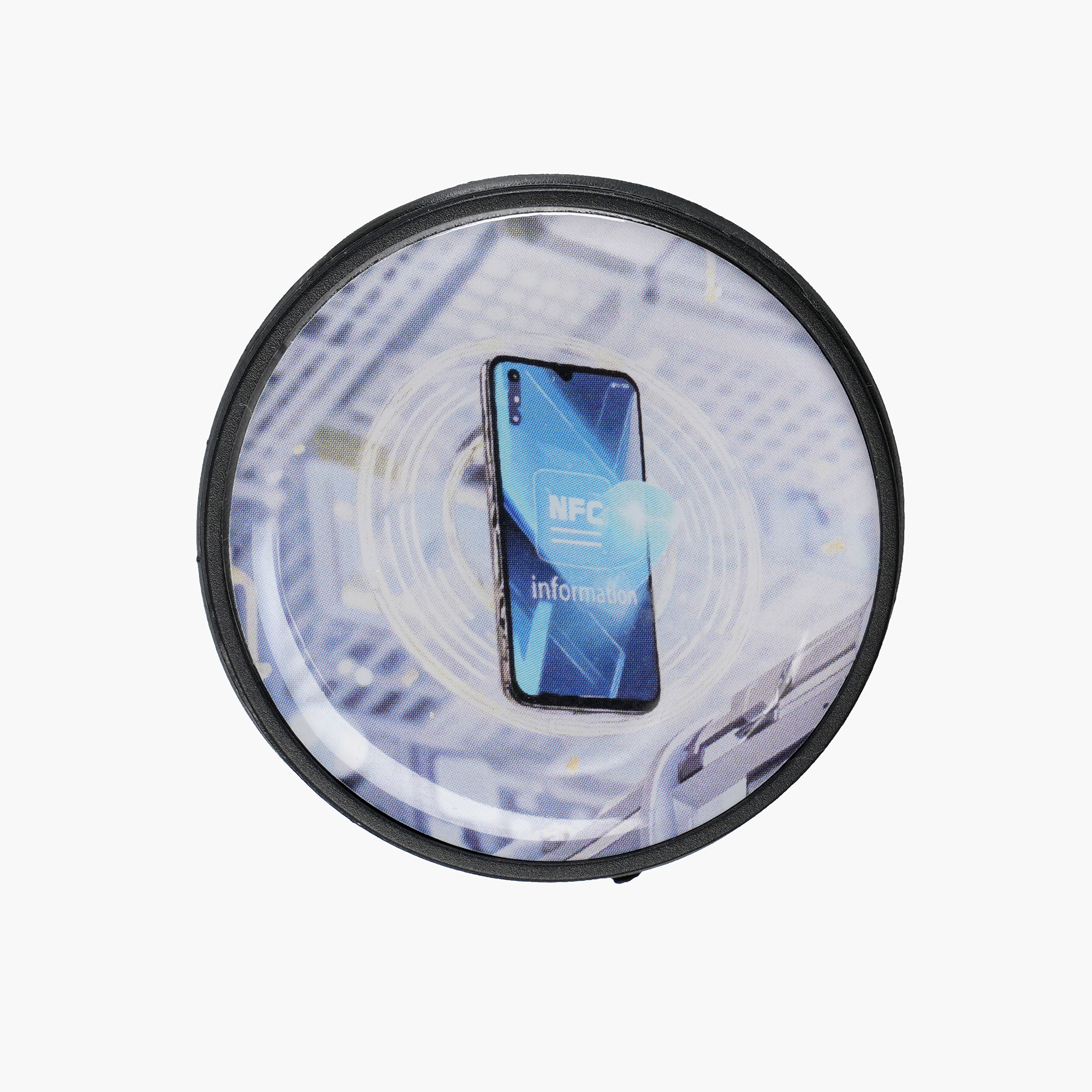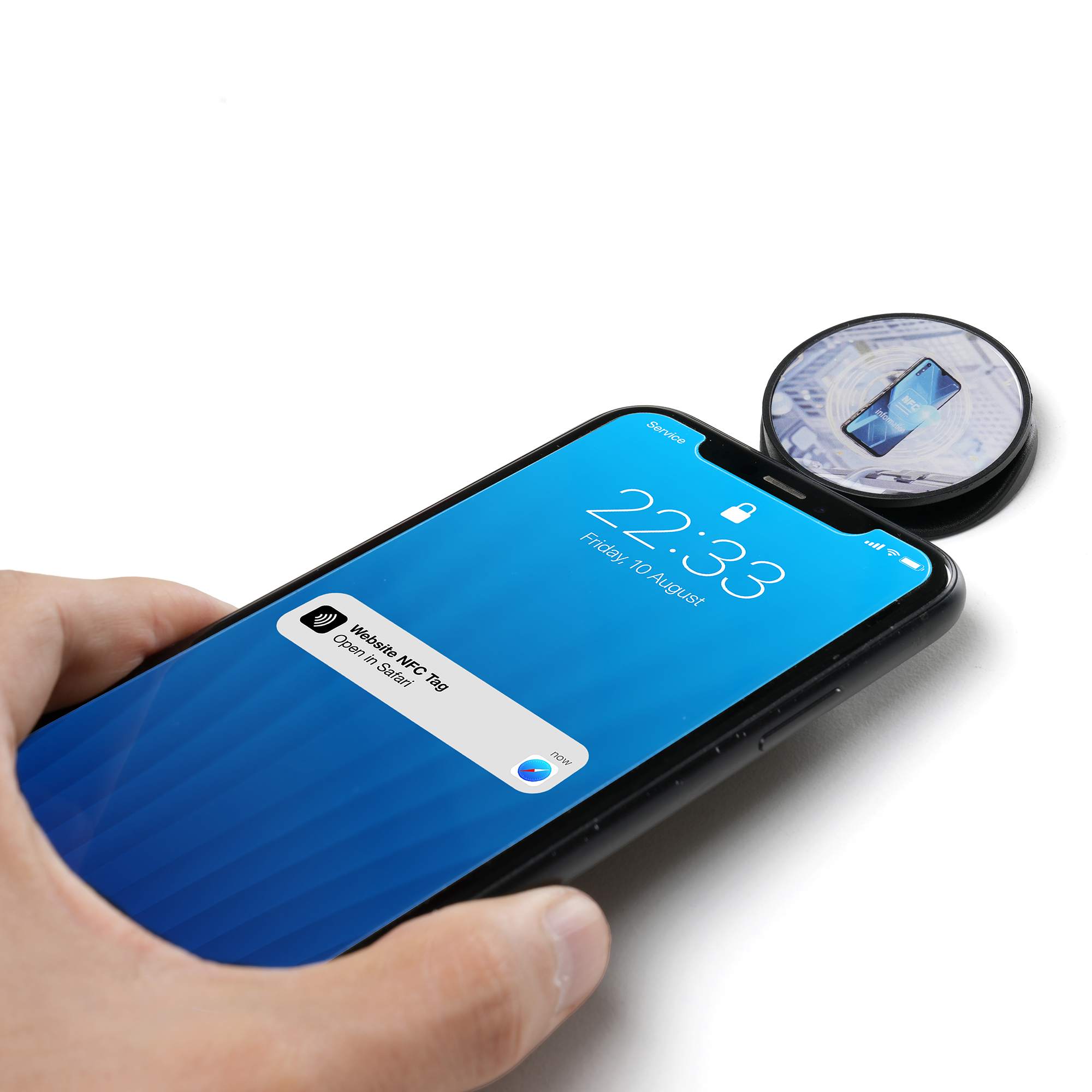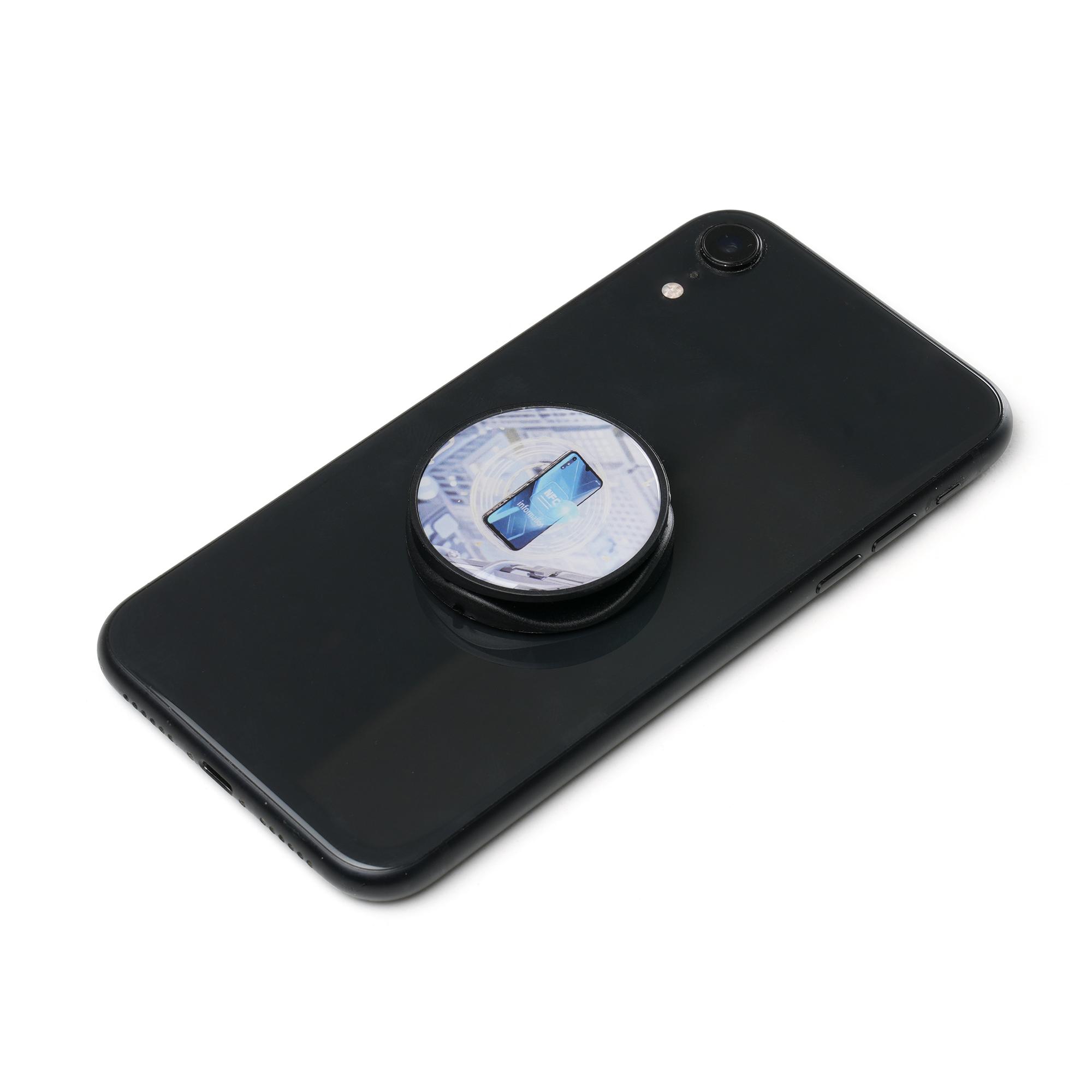 Slim plastic 2-in-1 phone stand featuring a domed sticker finish, embedded with an NFC chip. Instantly share digital information, links, or contact detail, just tap with any compatible device.