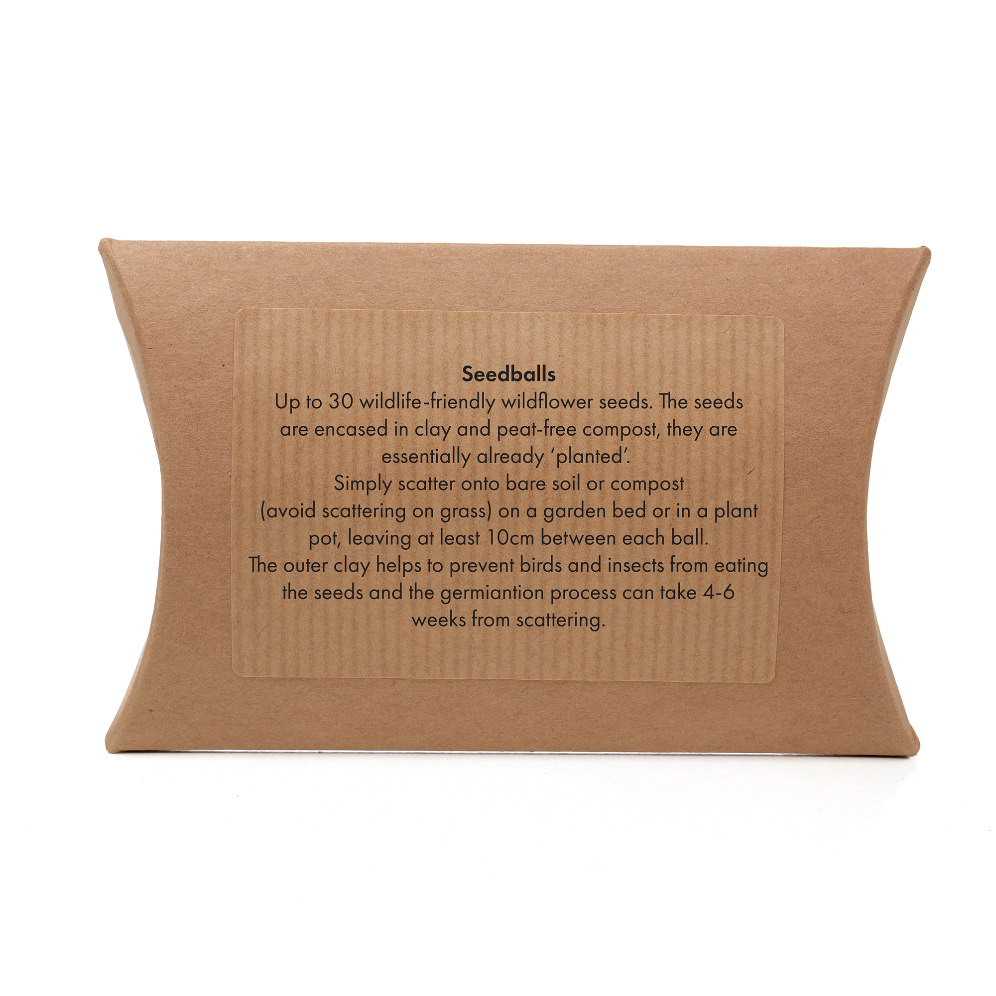 A compact pillow pack containing 6 wildflower seed balls, neatly presented in a natural lightweight and durable pack. Personalisation is available on the front, with easy-to-follow sowing instructions on the back making it an ideal giveaway for events, promotions and more.