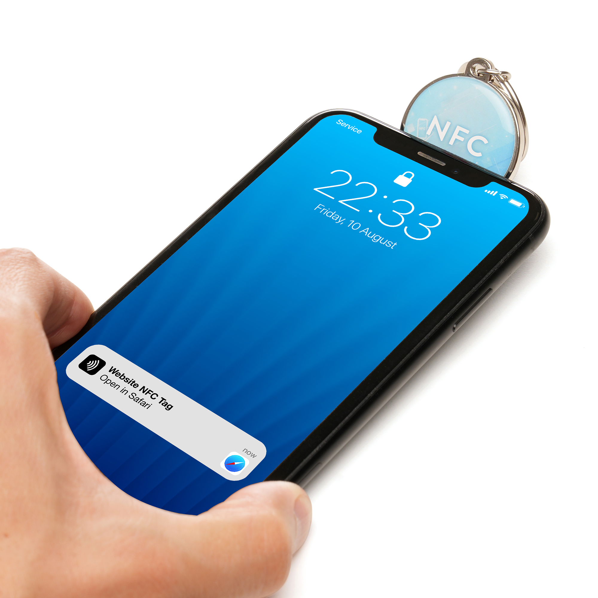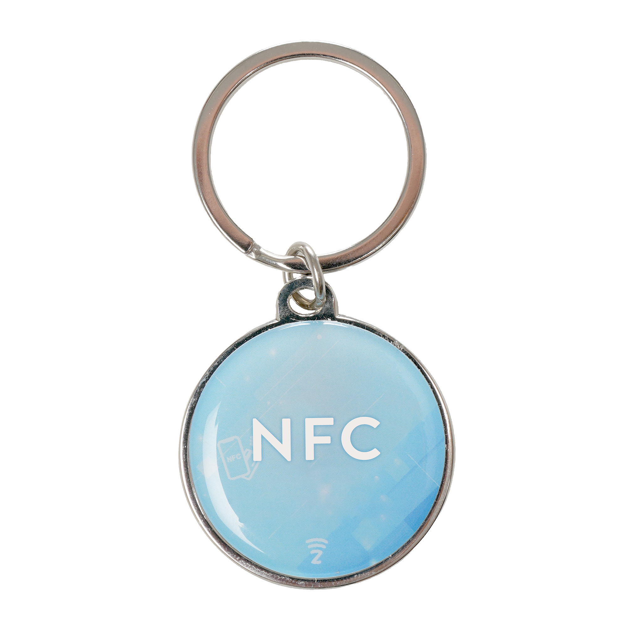A sleek metal keyring with a domed finish, customised to one side and embedded with an NFC chip. Instantly share digital information, links or contact details, simply hover a compatible device and tap.