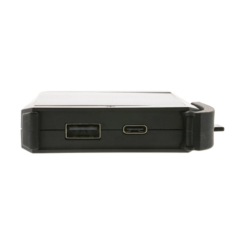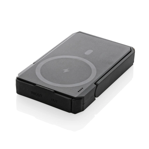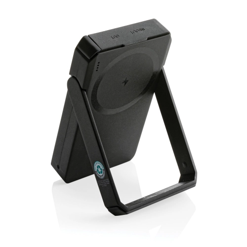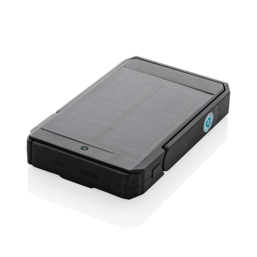 5.000 mAh solar powerbank made with RCS certified recycled ABS. Total recycled content: 21% based on total item weight. RCS certification ensures a completely certified supply chain of the recycled materials. The powerbank uses high quality monocrystalline solar panels with 19% conversion rate. Charge rate depends on conditions. With integrated stand function to use the solar panels at an optimal angle. The powerbank contains a long lasting grade A 5.000 mAh lithium battery. With 10W wireless magnetic charger to charge your phone without cables. Charging speed solar: 5V/130mA. Input type C: 5V/2A. Output: USB A: 5V/2A Type C: 5V/2A. Item and accessories PVC free. Including RCS certified recycled TPE charging cable. Packed in FSC® mix packaging. Registered design®