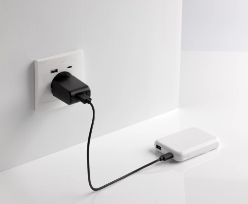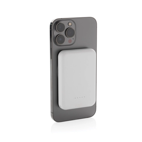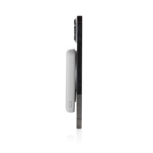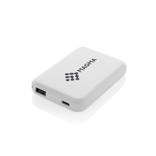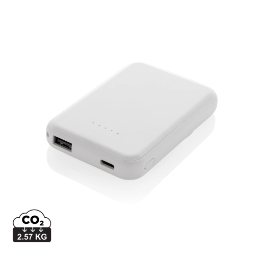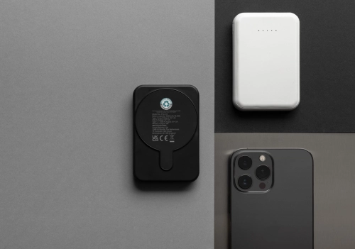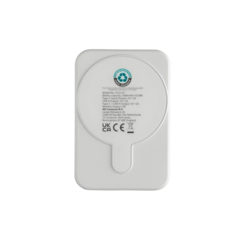 5.000 mAh pocket size powerbank with 5W magnetic wireless charger where the case is made out of RCS certified recycled ABS plastic. RCS (Recycled Claim Standard) is a standard to verify the recycled content of a product throughout the whole supply chain. Total recycled content: 20 % based on total item weight. With USB A and UCB C output option. The powerbank contains a long lasting grade A 5.000 mAh lithium polymer battery. The power indicators will indicate the remaining energy level so you always know when to re-charge.; Type-C Input 5V/2.4A; USB C /USB A output:5V/2A.4A Item and accessories PVC free. Including RCS certified recycled TPE charging cable. Packed in FSC® mix packaging.